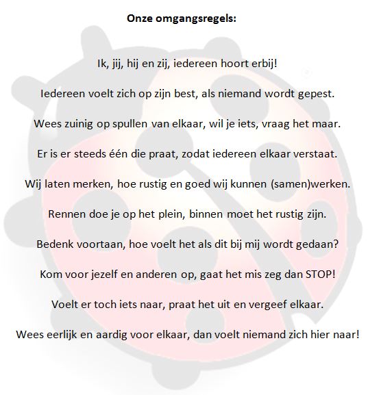 Op school hebben we ook regels met elkaar afgesproken. Deze zijn geformuleerd op school en klassenniveau om een goede sociale relatie tussen leerlingen, leerkrachten en ouders te waarborgen. Tevens zijn die van belang om structuur, duidelijkheid en grenzen te bieden. Voor ons zijn deze regels van belang om een werkzame situatie en een doorgaande lijn in de school te creëren.